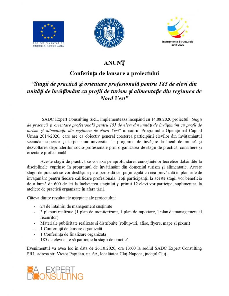 Se lansează proiectul “Stagii de practică și orientare profesională pentru 185 de elevi din unitățile de învățământ cu profil de turism și alimentație din regiunea de Nord Vest”